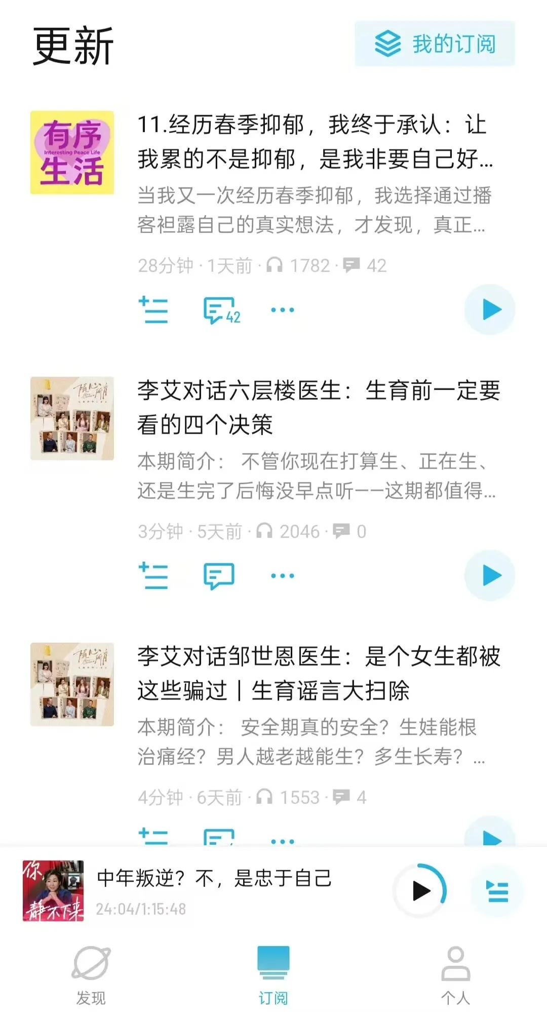 发现页说完了,接下来是订阅页。这里主要就是可以看到已经订阅的节目的更新。像我经常听的《有序生活》,她们更新我就可以在这个页面看到,然后加入播放列表。