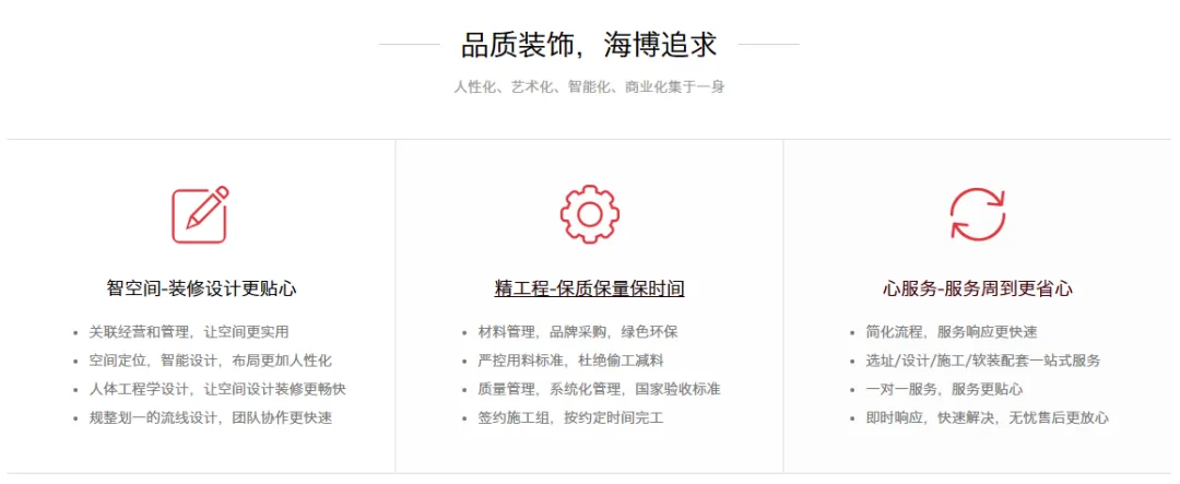 公司拥有系统化、精细化的项目管理体系,为客户保质保量保时间,打造放心工程。“主动服务,超越期待”的服务理念深入每个海博人的内心,支撑海博人用心去创造出一个又一个的品质空间,获得业界及客户的尊重和好评。