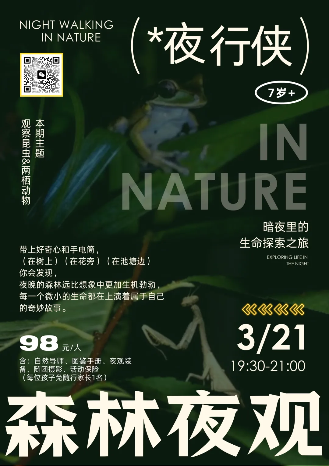 大家手持手电筒,轻轻拨开草丛、探寻树下、驻足池塘边,用柔和的光束,去搜寻那些悄悄活动的“夜精灵”。你可能会遇见正在艰难蜕变的昆虫,见证生命成长的奇妙瞬间;可能会偶遇出来觅食的两栖朋友,观察它们独特的夜间活动习性;让我们在黑暗中,重新认识森林的温柔与生机。