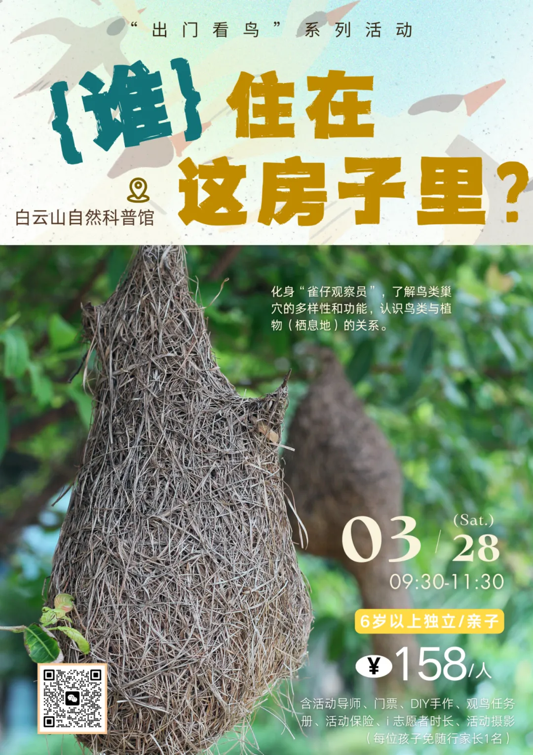 3月的白云山不止有花开 还有藏在林间的飞行家们!带上望远镜,化身”雀仔观察员“,认识身边常见的鸟类,户外探寻观察碗状、球状、洞巢等各式鸟巢,解锁户外观鸟的快乐,还能亲手搭建仿生鸟巢。