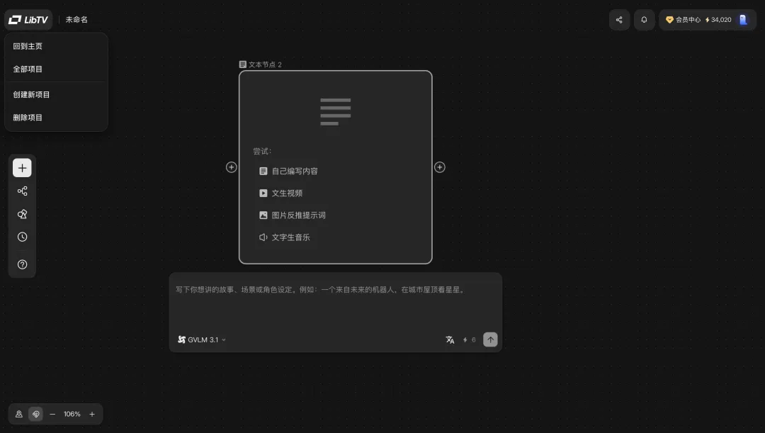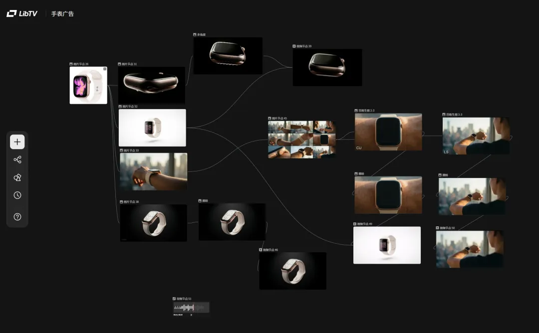 面向人类创作者,LibTV提供了一套专业的视频创作工具,我们可以通过节点工作流和无限画布完成从剧本到成片的全流程。