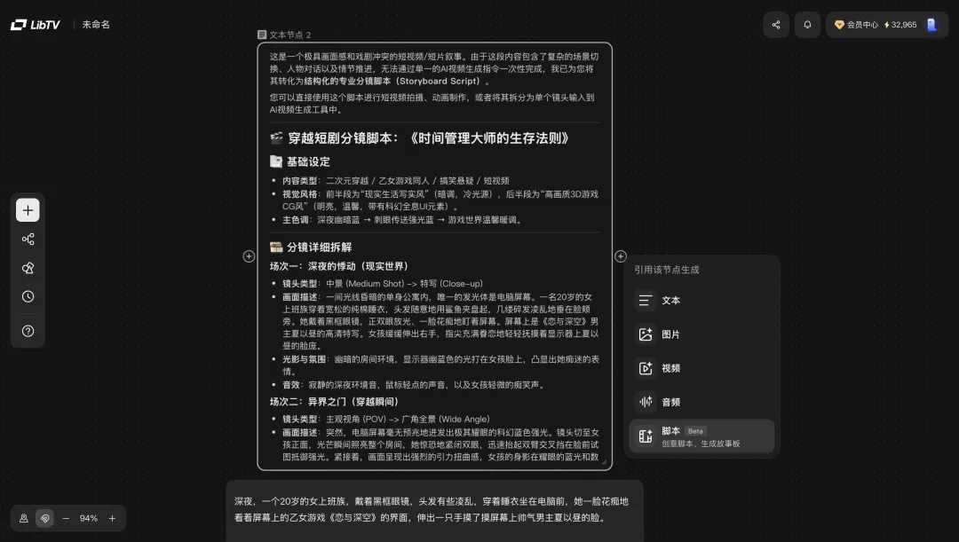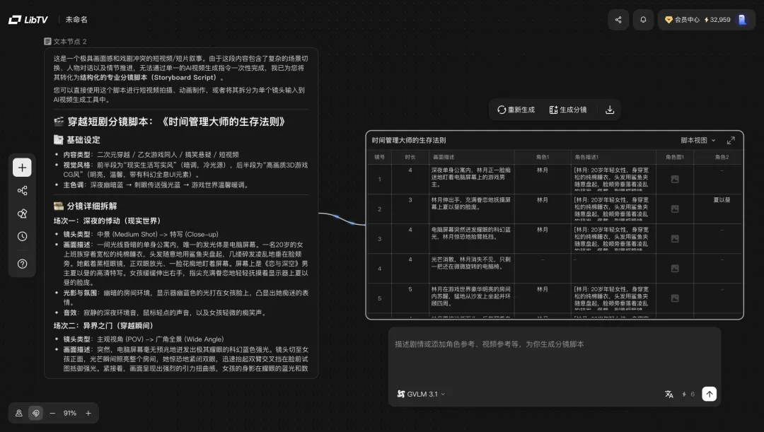 我们先是在画布中双击新建一个文本节点,输入了简单的故事大纲,然后LibTV直接调用内置的创意脚本功能,生成了一份专业的结构化分镜脚本,剧名都给我们起好了。