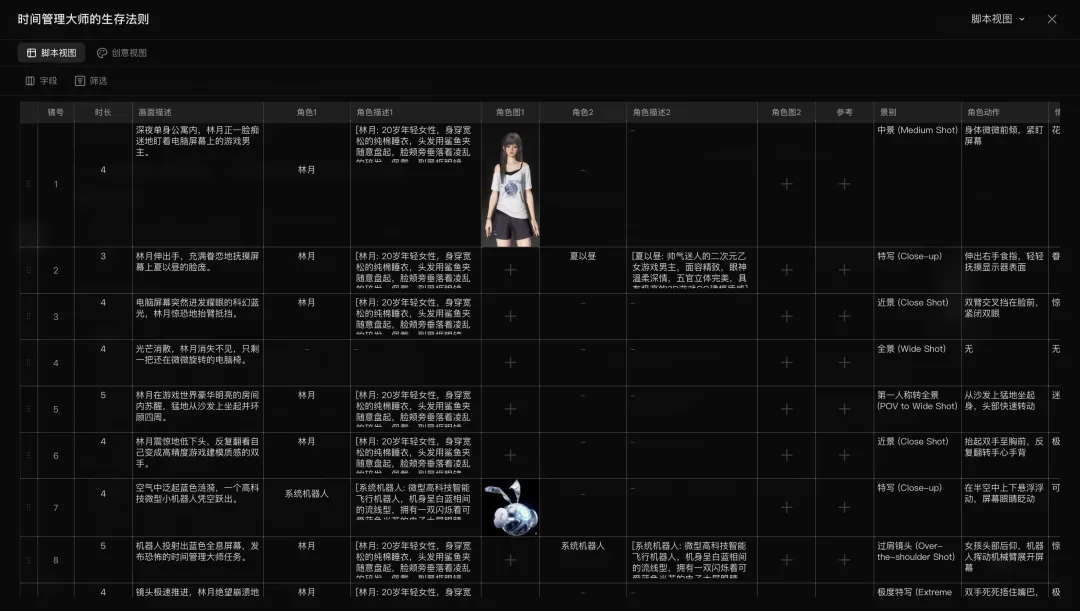 在LibTV的脚本视图界面,时长、画面描述、具体的角色设定、景别和镜头动作都得到了详细拆解,你还可以给每个分镜上传参考图,比如我们为女主林月设定了穿着宽松睡衣、戴着黑框眼镜的居家宅女形象。
