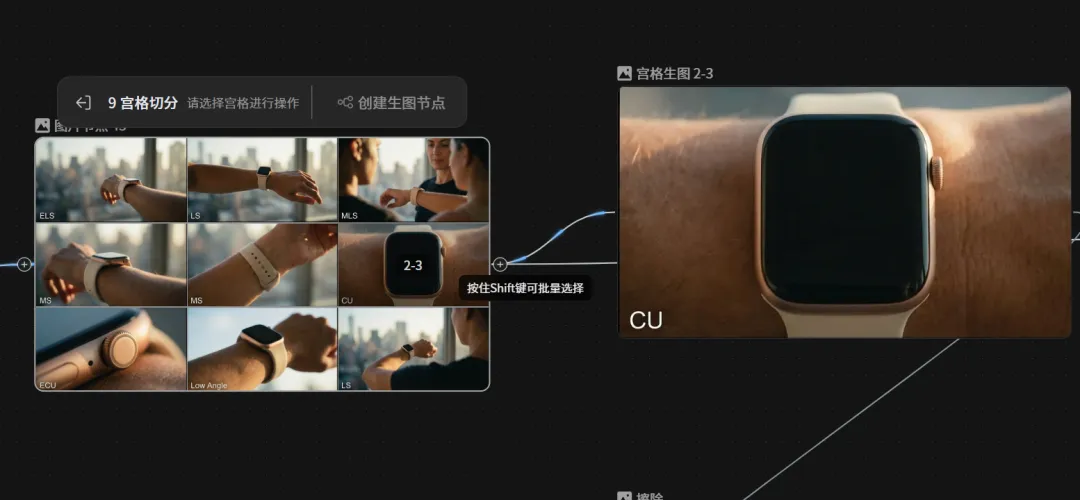 多宫格切分器也非常好用,是LibTV的独家功能。当我们生成了9宫格、25宫格多角度的分镜图,需要先切分选择合适的镜头才能拿去生成视频,不然整个拼图是不能直接用的,有切分器就方便多了,可以一键选择多个镜头再生成。