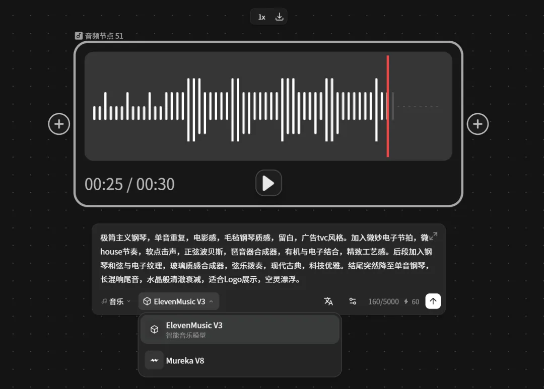 视频素材生成好后,我们想配个背景音乐,这时候也不用打开其他网站,LibTV就支持生成音乐,输入我们想要的音乐风格,选择模型ElevenMusic V3,时长可选30秒至4分钟,很快就得到了可用的音乐。
