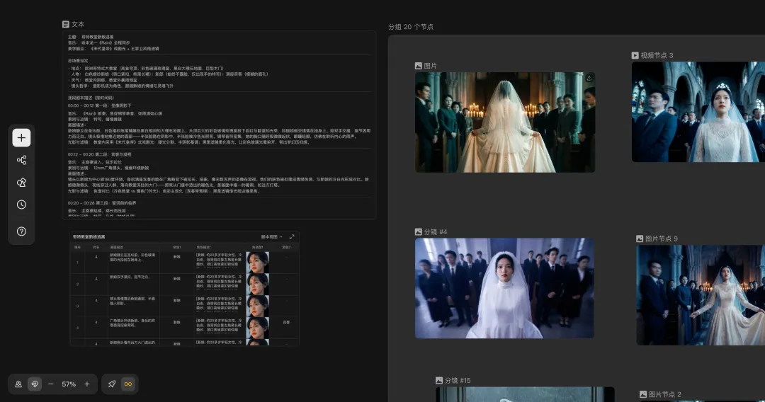 过去我们在不同页面和工具间来回倒腾垫图、修改提示词的繁琐操作,在这里被简化成了顺畅的节点连线。如果对分镜图不满意,单击图片即可修改提示词重新生成,最终成片完成度很高。