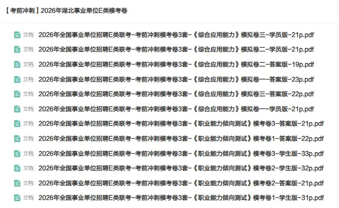 可下载打印!E类考前冲刺预判三套卷 2026年事业单位联考 3月28日A类笔试 3月29日BCDE类笔试 考前冲刺3套卷+答案解析考前精研,可下载打印 ↓↓↓↓E类考前3套卷+答案↓↓↓ 点击下图即可购买 本资料为电子版,购买后,按照方法操作查看 资料资料支持下载,下载后可打印 了解更多招考信息 扫码添加老师微信咨询笔面课程 选岗答疑、资料领取