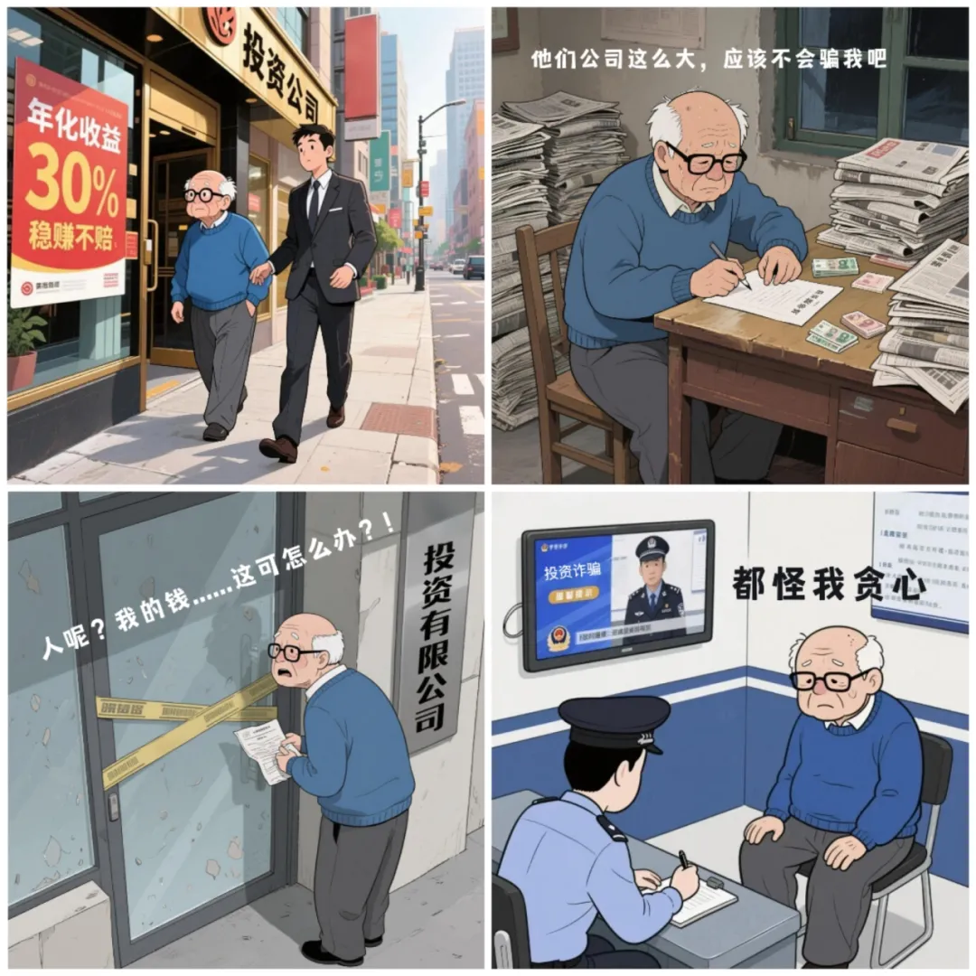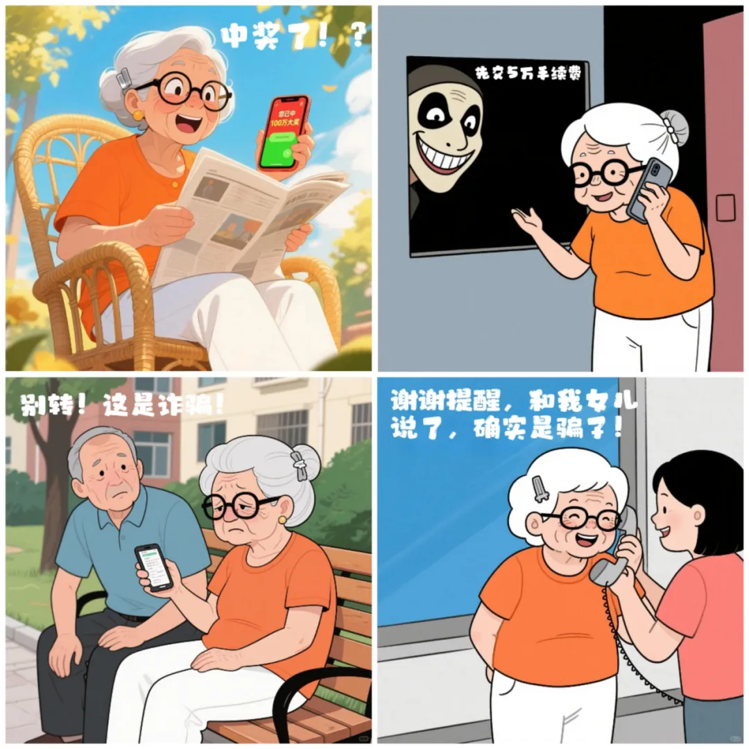 近年来,针对老年人的诈骗犯罪频发,健康陷阱、投资返利、中奖骗局等手段层出不穷,严重损害老年群体的财产安全和身心健康。检察机关立足法律监督职能,通过反诈宣传织密防护网。本期推送通过四格漫画为大家普及养老诈骗的常见手段和防范措施。