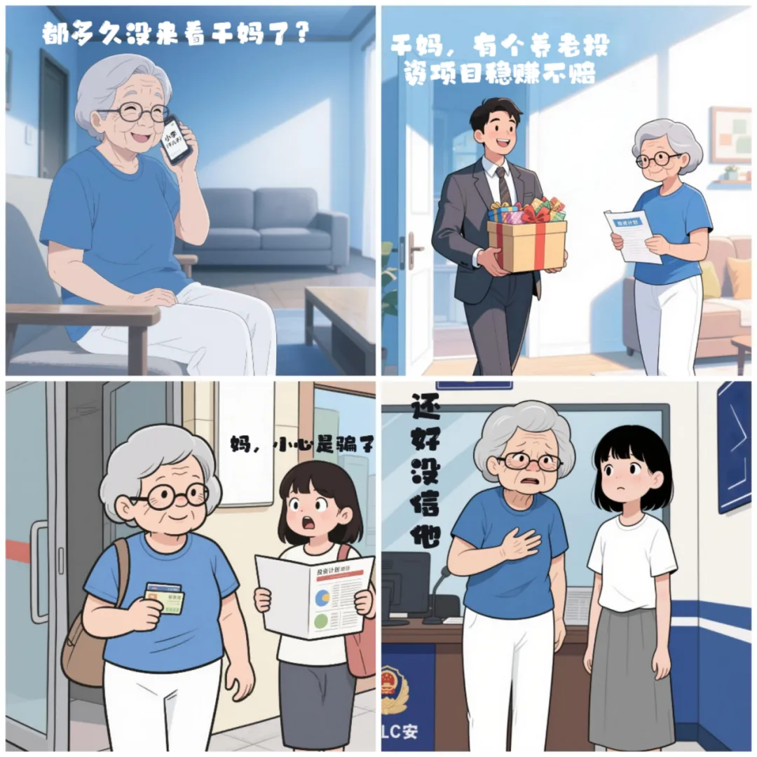 谨记“三不原则”:不轻信稳赚不赔的宣传,不投资不明项目,不向个人账户转账,大额投资前务必和子女商量,警惕“保密要求”“限时优惠”话术,天上不会掉馅饼,高收益必藏高风险!