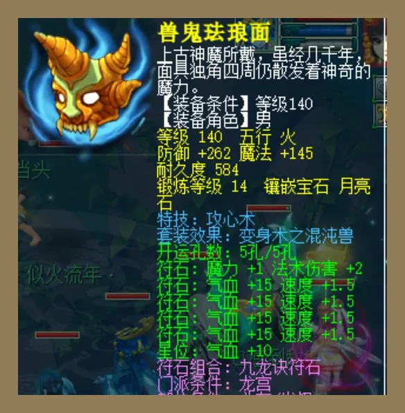 比如这件140级头盔就很有代表性,它带有攻心术这种偏法系特技并且还挂上混沌兽套装效果。由于有特效和装备,所以可以兼顾功能性和面板收益两个方面。再加上宝石等级全部拉满之后,总防御直接提升到一个非常舒服的数值,在战术体系中这样的一顶帽子就是那种“你不一定每场都要用,但是关键局一定要拥有”的类型。喜欢打架的人肯定不会不喜欢这样的细节让对面法防难受吧?真的好。