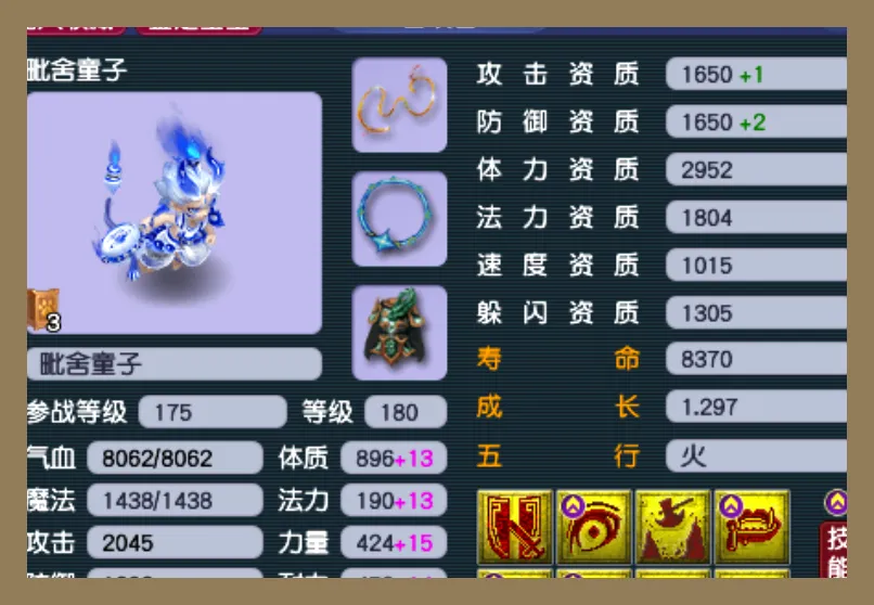 这童子就是典型的“任务耐攻答案”,气血直接飙升到8000+,防御也达到了一个非常扎实的程度,力量没有到达极限但是攻击依然足够。它的价值在于:因为站得住脚,所以输出时间更长,在怪物高伤害回合的时候也不会轻易暴毙。如果你平时杀难度不多的话,那么它出现的机会就会少一些;但是如果开始冲难度了,你就会发现这个宝宝属于“越用越好”的类型,可以把翻车率降下来。