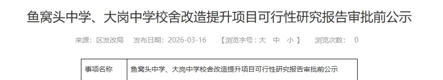 其中公告提到:本项目拟对鱼窝头中学、大岗中学部分校舍进行改造提升,涉及总建筑面积约2.6万平方米。