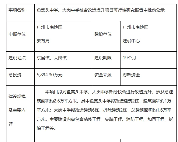 近日,南沙区政府发布一则鱼窝头中学、大岗中学校舍改造提升项目可行性研究报告审批前公示。