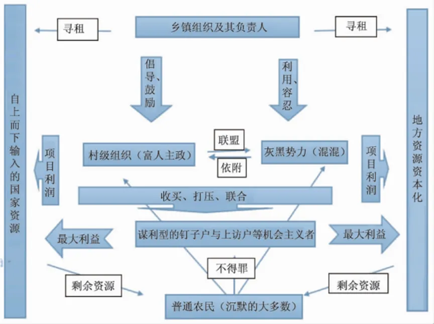 农业税费取消之后,国家不断输入资源以保证农村公共服务的提供,然而,普通的村庄既无力配套相应财力承接自上而下的项目资源输入,也无法在项目实施过程中与少数谋利性的机会主义农民协商合作,从而呈现出普遍的消极主义心态。与此同时,地方政府积极鼓励先富群体参与村庄选举,一些富人与灰黑力量成为村庄主政的主体。富人与灰黑势力治村不同于普通的村干部,他们可以利用自身“黑白两道”通吃的优势,既能向上索要项目,又能通过金钱和灰色势力摆平项目实施过程中的机会主义者,实现村庄的摆平式“积极”治理。但在资源流变的过程中,争资跑项和推动地方资源资本化的乡镇组织,富人主政的村级组织及其统辖的灰黑势力,以及少数善于抓住机会进行谋利的机会主义农民,形成了乡村社会的分利秩序,普通民众却被排除在外。这一分利秩序中的行动主体之间相互依赖,相生相成,共同形成一个阻断、耗散、蚕食和分割利益的一种相对结构化的力量和状态,乡村治理内卷化。