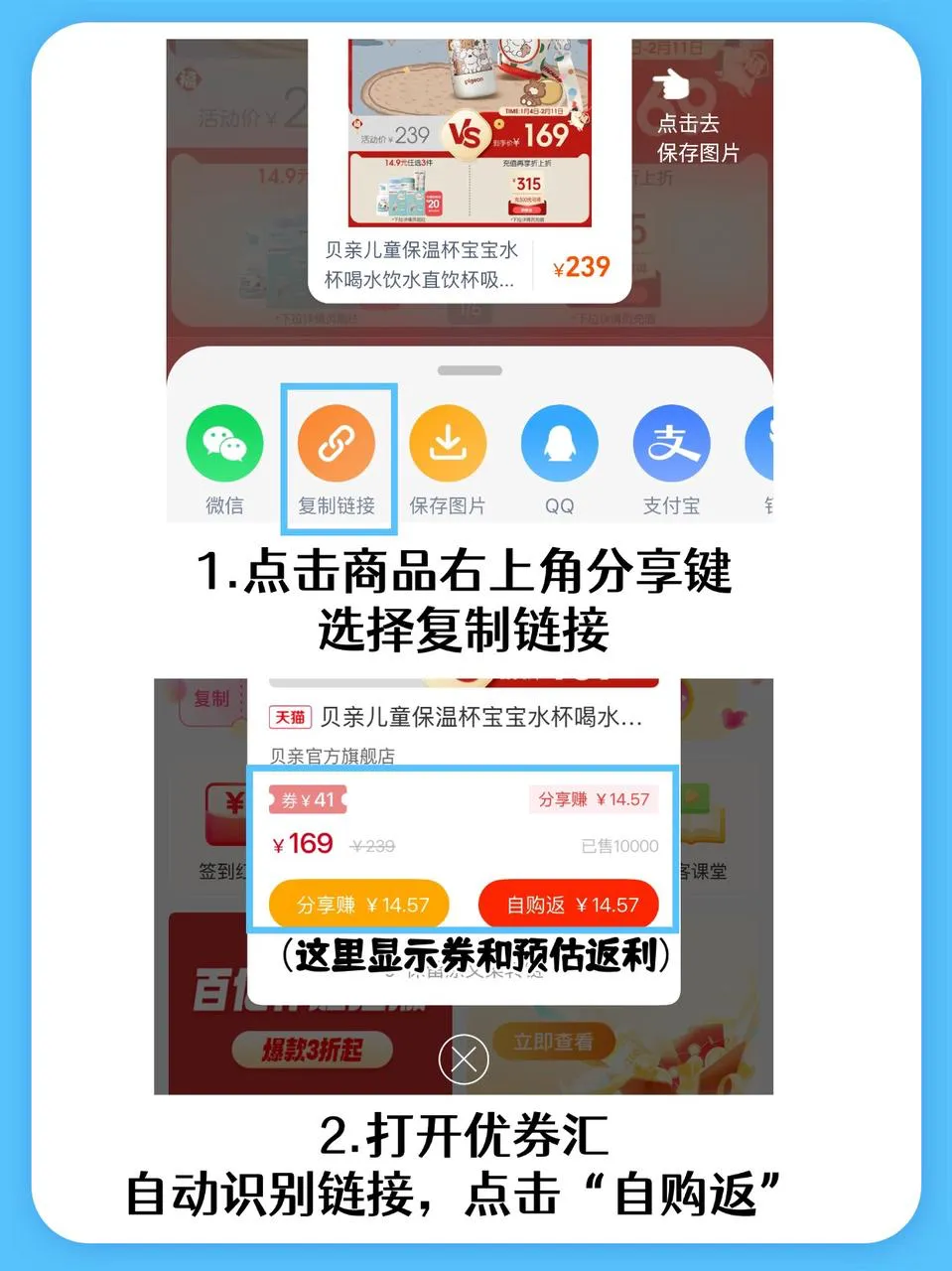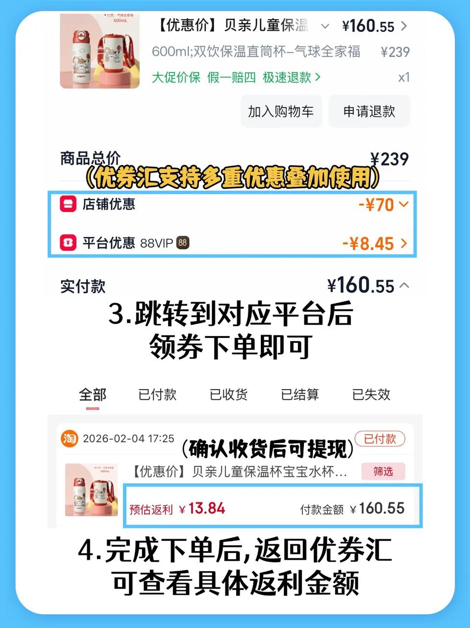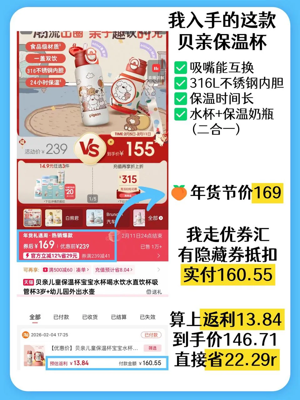 贝亲保温杯官方旗舰店年货节价格169元→优券汇有隐藏券抵扣→实付160.55元→返利13.84→到手价146.71,省22.29r