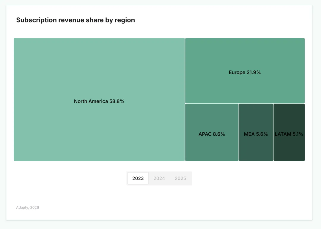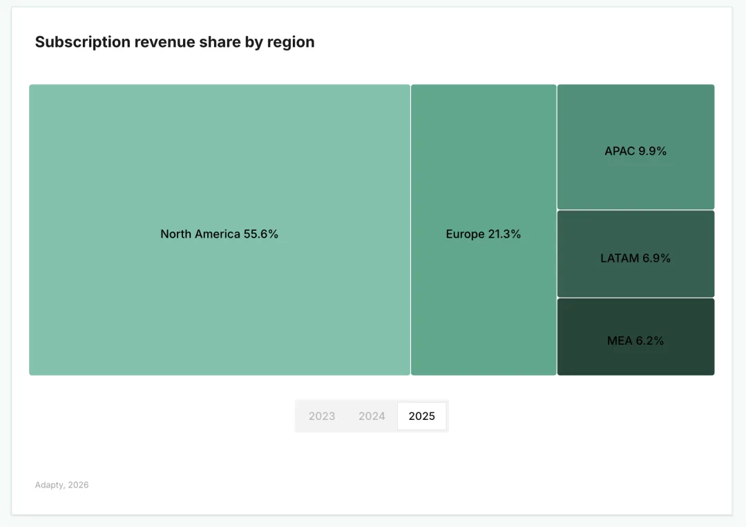 背景:基于 16,000 多款应用的真实订阅营收数据,大部分数据来自苹果 App Store,在涉及商店对比时也包含 Google Play 的数据。分析范围覆盖 2025 年。所有收入均为总收入以美元计。接下来更多的也是我个人解读,但报告来自九日论道全年合作伙伴Adapty团队,目前没有中文版(暂时我自行翻译+全篇解读),盗版必究。