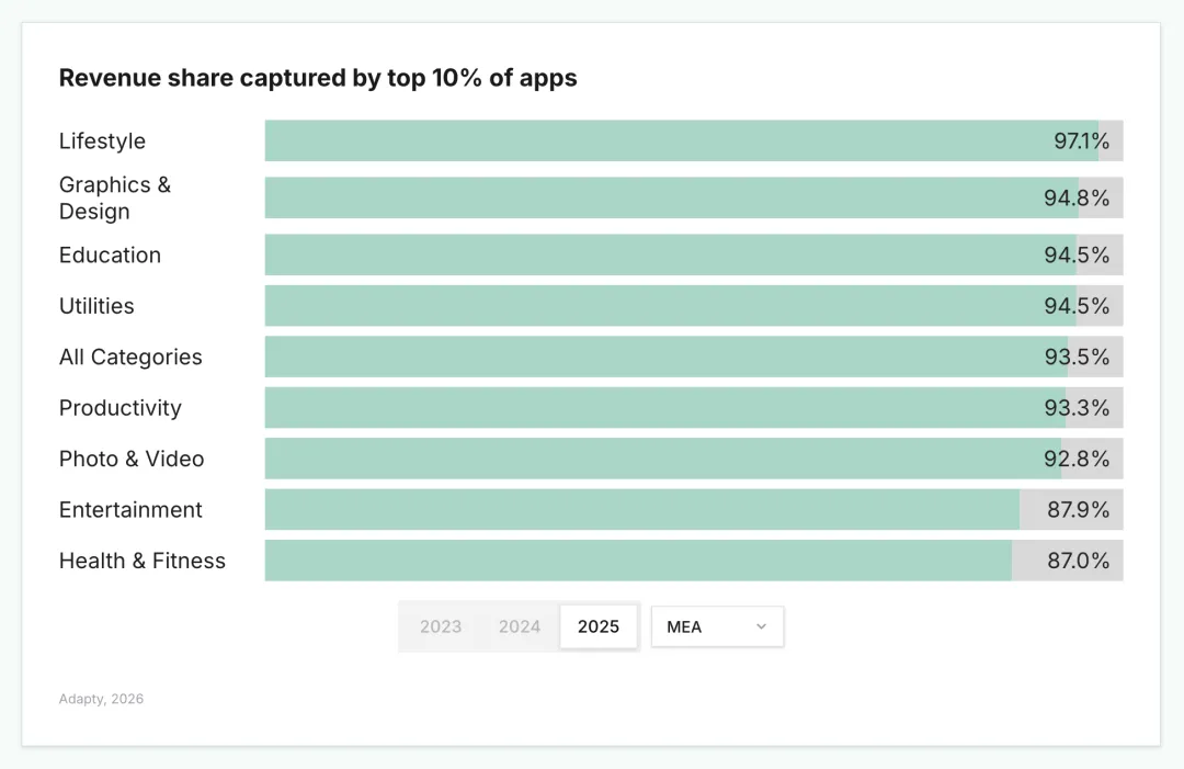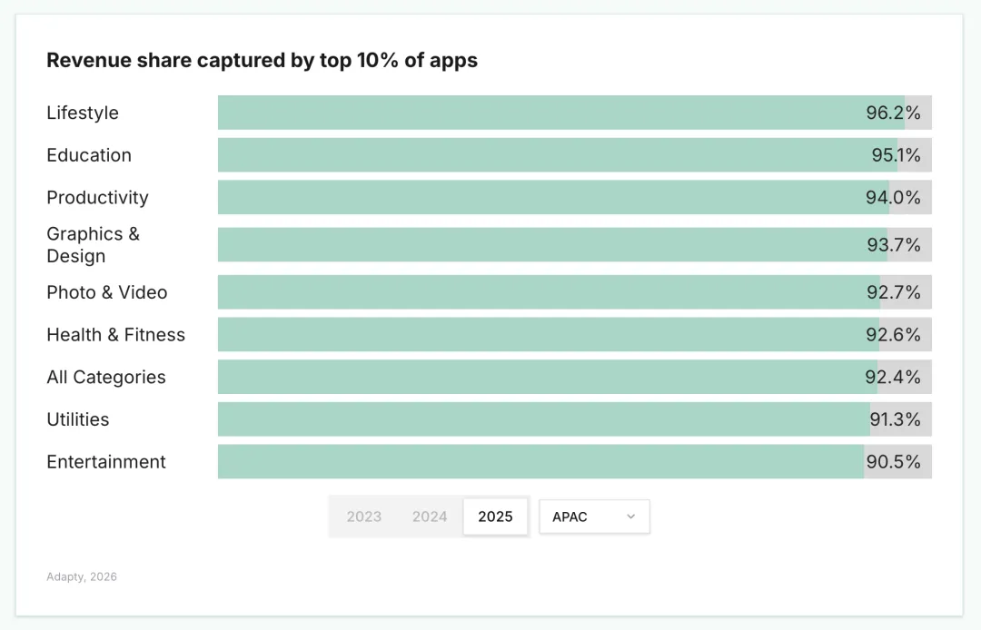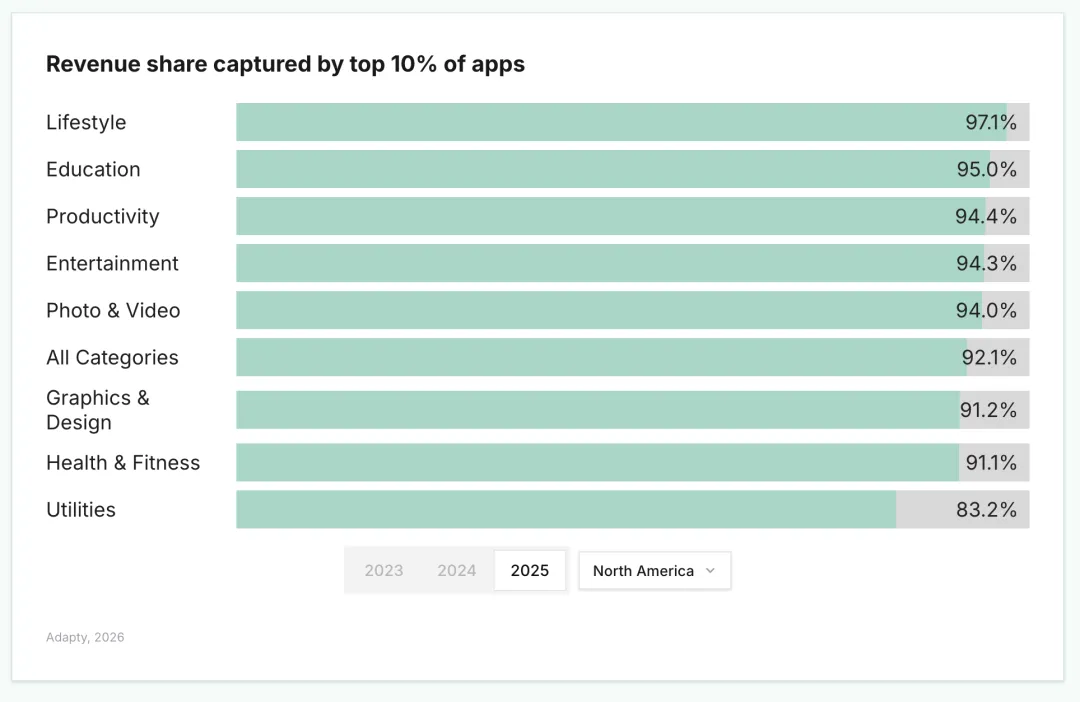 排名前 10% 的应用赚走了全部应用收入的 95%;其中 Lifestyle(生活方式)品类的集中度全球最高,占比达 97.93%。