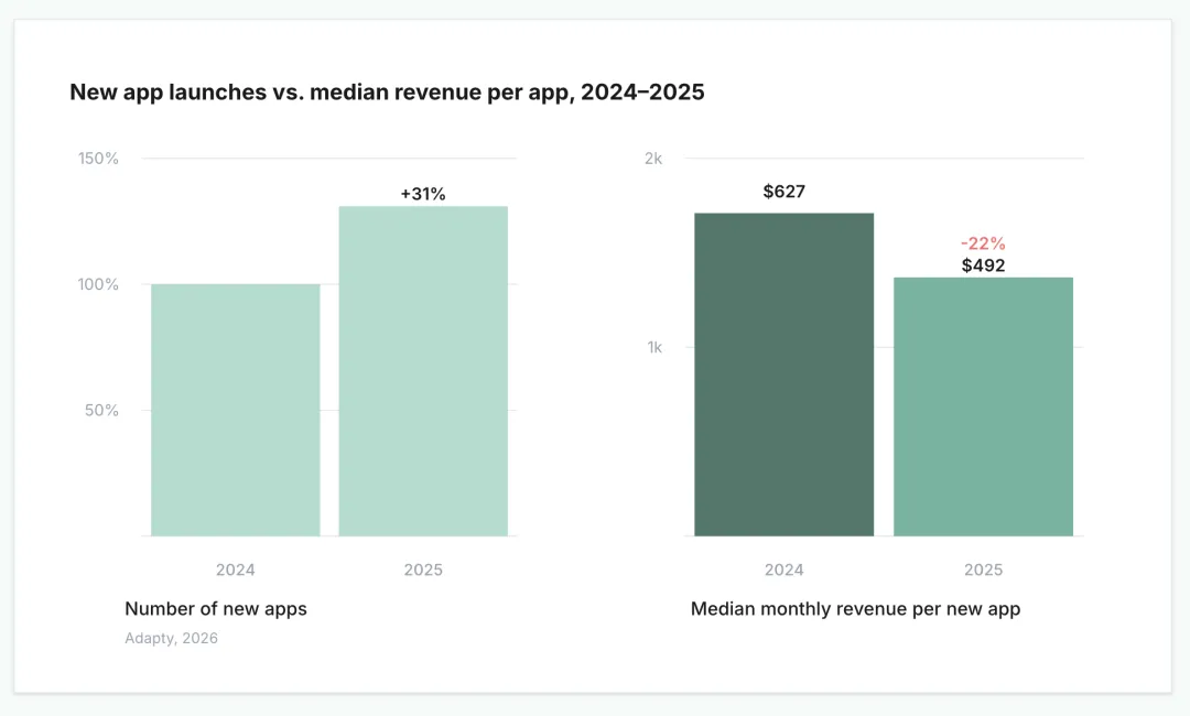 到 2025 年,应用发布数量增加了 31%,但个体收入反而更少