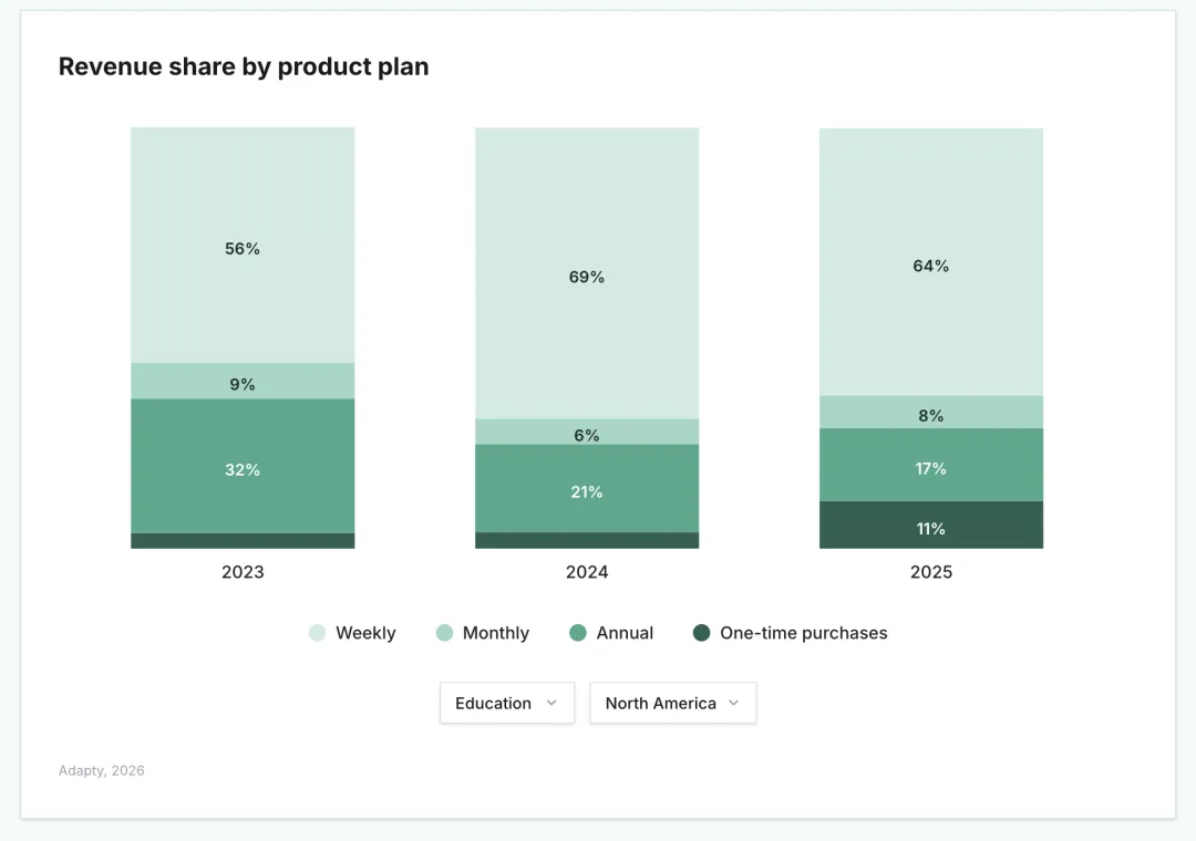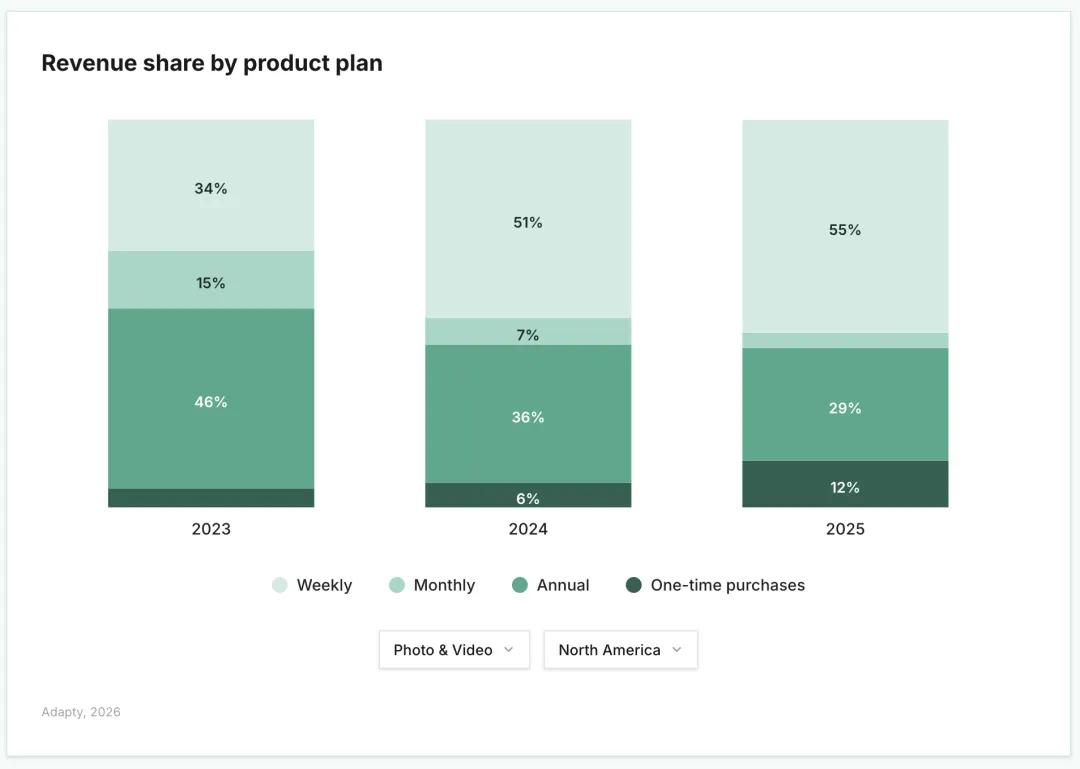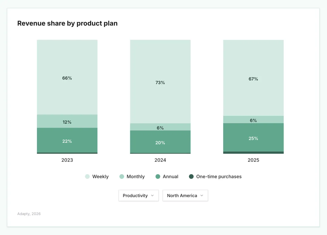 1. 一次性付费(包括消耗型内购和终身订阅)正在稳步增长——占比从 2023 年的 6.4% 提升至 2025 年的 10.3%。