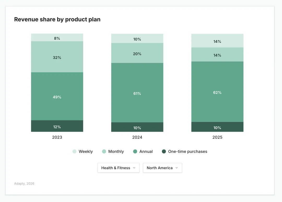 2. 健康与健身是唯一一个“年付订阅”不仅占主导地位,而且份额还在持续增长的应用品类