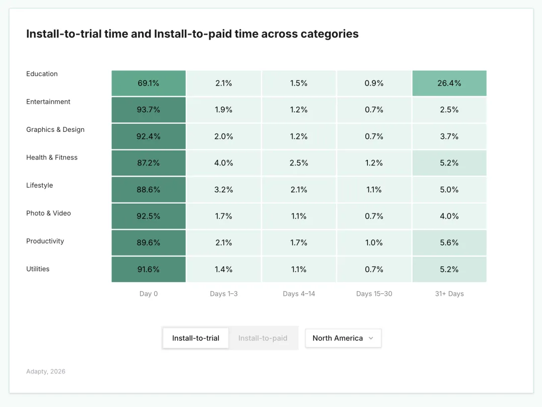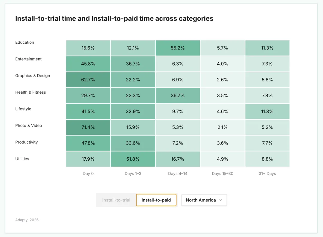 2. 在健康与健身类应用中,用户要么在第 0 天购买,要么在第 4–7 天购买,这凸显了试用机制在该品类中的成功效果。