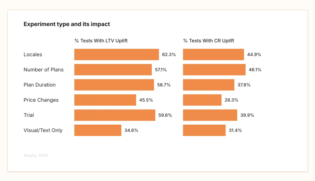 3. 价格测试很少能提升转化率(仅 28% 成功率),但有 46% 的情况下能提高用户生命周期价值(LTV)。