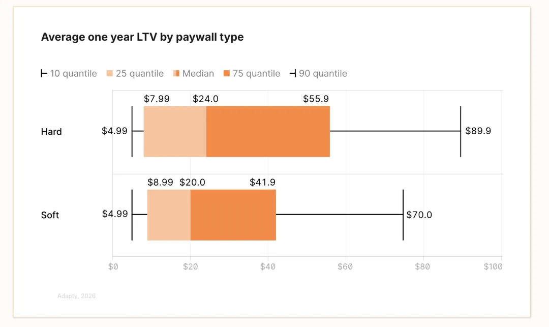 硬性付费墙(hard paywalls)能带来比其他模式高 21% 的用户生命周期价值(LTV)