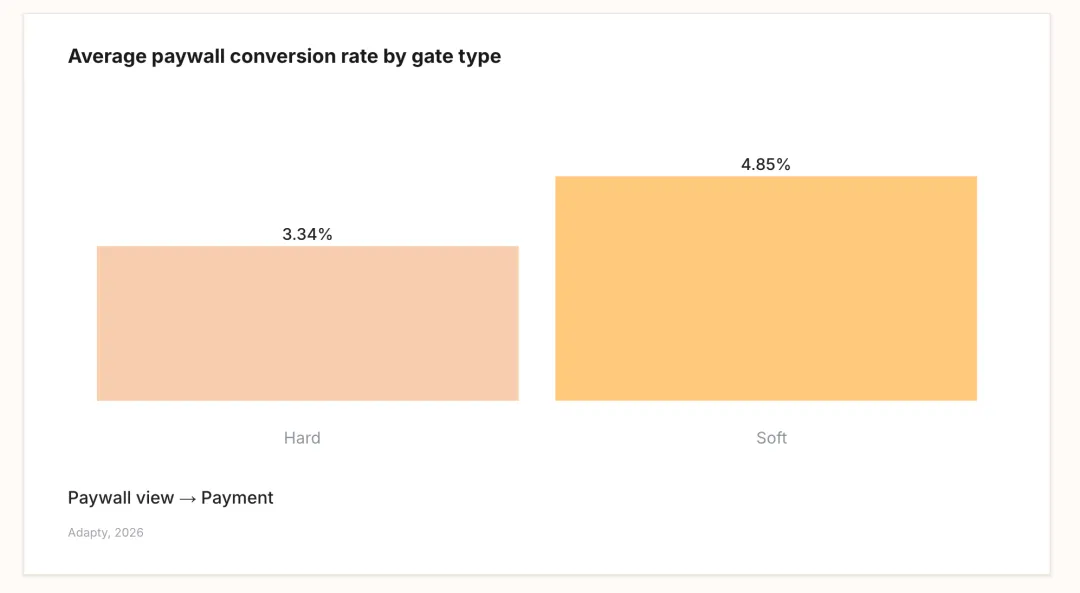 低消费用户无论哪种付费模式支出大致相同,差异主要出现在高端用户——使用硬性付费墙的用户支出比中位数高出 20%–33%。