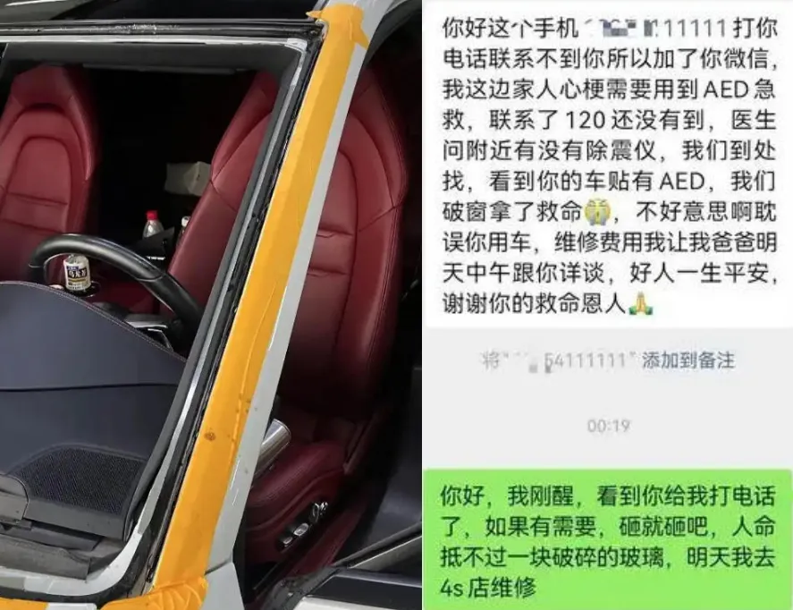 由于一时联系不上车主,于是该市民选择破窗取出AED用于急救。最后,被救者脱离危险,砸窗者也和车主取得联系,说明情况并提出要承担维修费用。但被车主婉拒了。