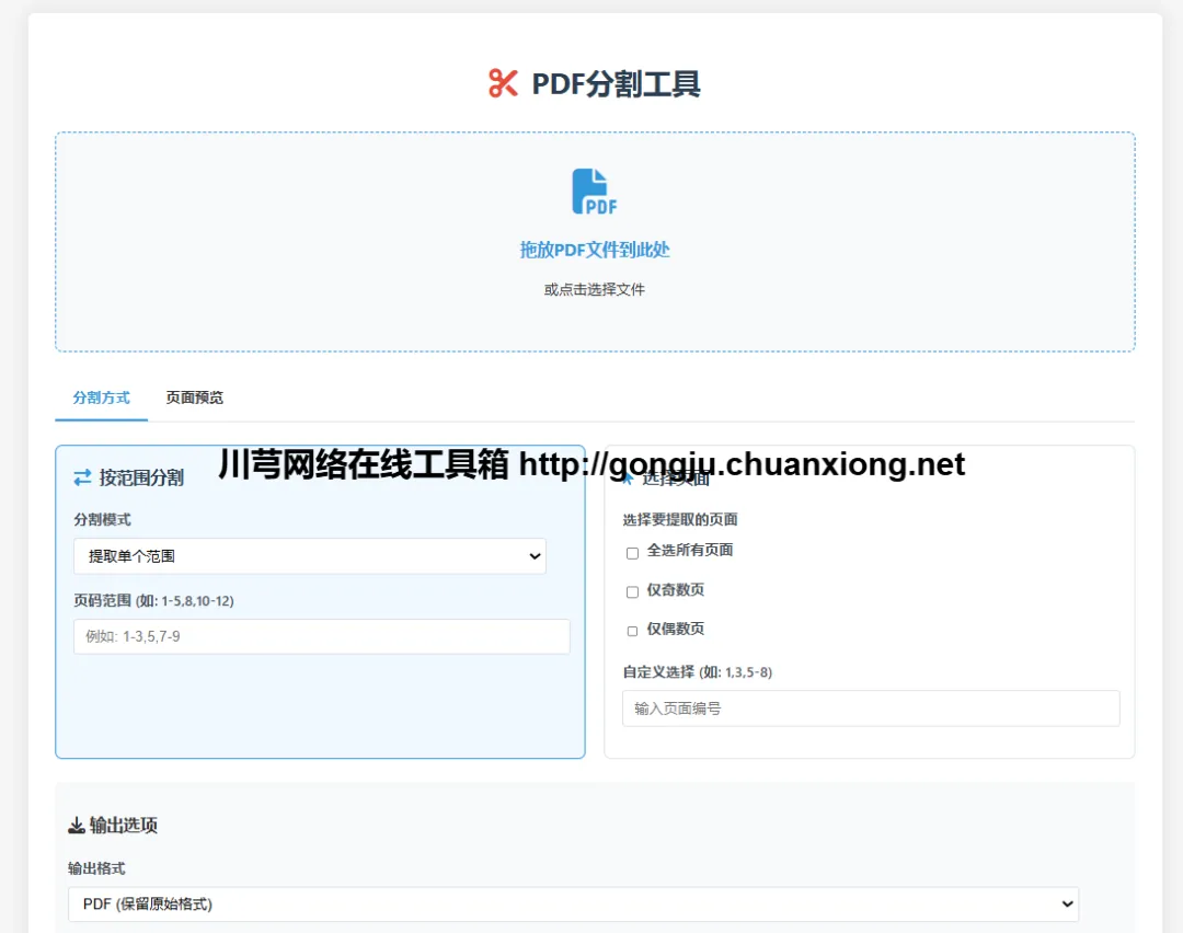 川芎网络在线工具箱中的这款PDF在线分页工具提供了多种灵活的分割方式: