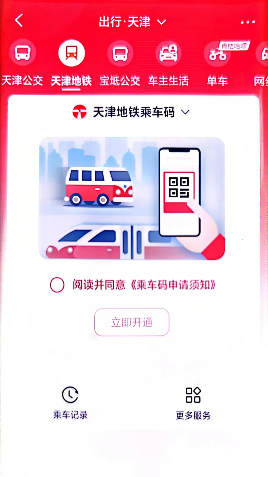 打开“云闪付”APP首页,左上角定位选择“天津”,点击“出行”,进入“出行”界面后点击“天津地铁”即可进入开通页面,按流程操作完成开通。