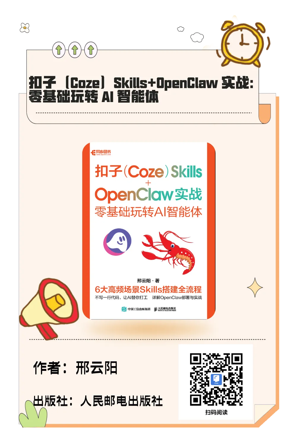 全书分为5个部分。帮你厘清智能体与 Skills 的核心概念及其关系,并介绍扣子平台与扣子空间的使用方法;、通过 6 个由浅入深的实战项目,覆盖文字型、图文型 Skills 的开发,涵盖直播带货话术复用 Skills、股票技术分析 Skills、微信公众号文章配图 Skills、小红书图文生成 Skills、PPT 创作助手 Skills 和数字营销 GEO 与 SEO Skills这6个高频场景。帮助普通用户像使用提示词一样轻松驾驭Skills。系统介绍了 OpenClaw 在扣子编程平台的部署与集成方法,以及基于 OpenClaw 添加与使用 Skills 的实战。