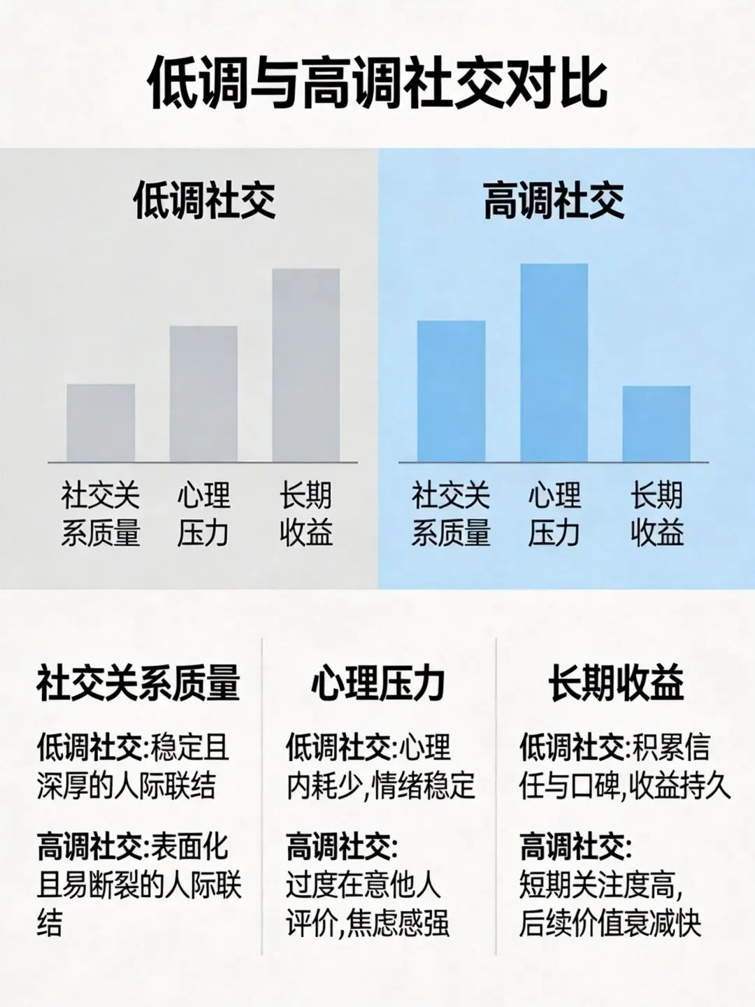 心理学研究显示,低调的人更容易建立”深度关系”——因为别人对你的期望是真实的,而不是被你塑造的”人设”绑架。这类关系更稳定、更值得信赖。启示:短期看,低调好像”吃亏”;长期看,低调让你获得真正的信任。