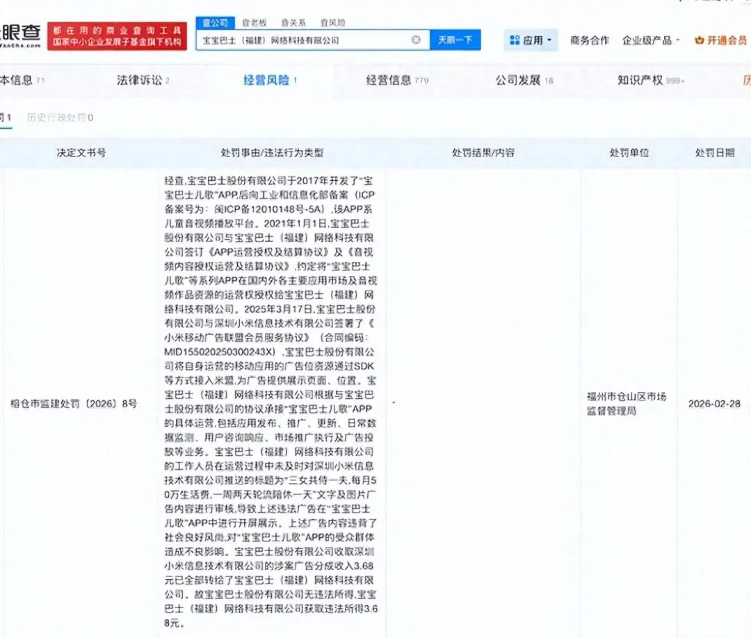 3.68元,这是宝宝巴士从这条低俗广告中获得的违法所得。