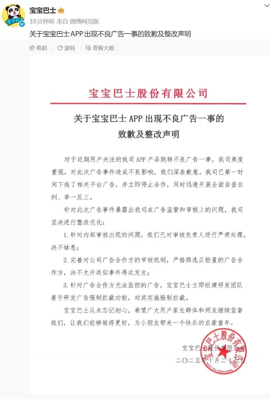2025年10月家长集体曝光时,宝宝巴士火速下架问题广告、升级拦截功能,还处理了审核负责人。但这一系列动作更像是危机公关,而非根本性的机制重构。否则,怎么解释一个广告联盟合作签了半年多,审核漏洞一直没堵上?