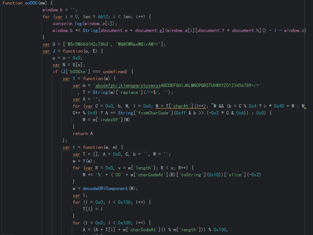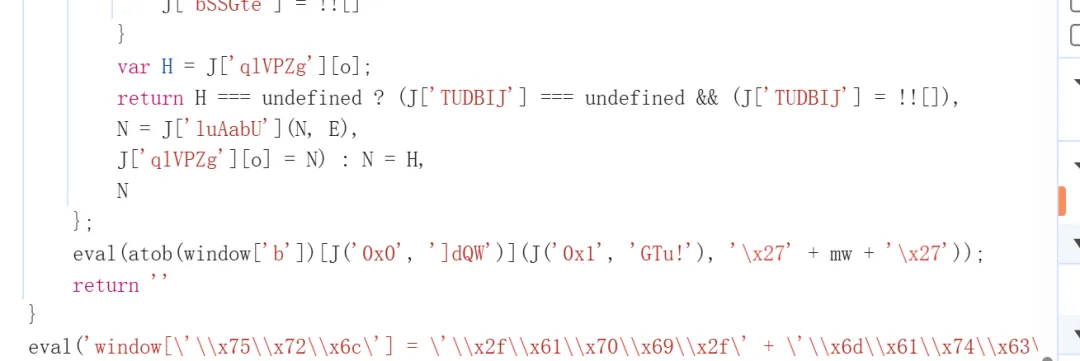 最后在返回前进行了eval(),其实是将window[‘b’]给base64解码了,至于window[‘b’]怎么来的,自然是window.a转换过来的。不过不用担心,这是个定值,断点打到位,copy(atob(window[‘b’]))拿到加密算法。此处还需要注意,最后将mwqqppz换成了mw