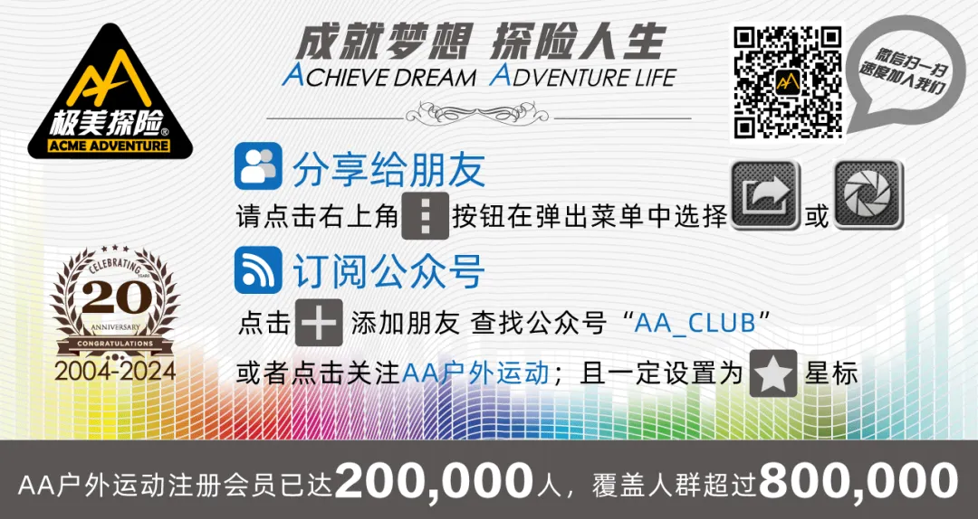 AA户外运动俱乐部成立于2004年,一直致力于推动云南及中国户外运动的发展,坚持每周短线活动,每月的公益环保,到每年已成为标杆项目的大型活动AA百公里。历经二十二年从未间断的活动组织,从哈巴雪山起步,到跨大洲越洋组织活动,已经成为云南人气最高、活动最丰富的户外运动组织,拥有线下户外运动体验馆和最全面的户外智库及最专业领队团队,是每次活动安全顺利的坚强后盾。