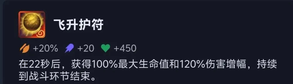 神器飞升护符小名叫“金丹”有句话是这样说的“金丹一开直接飞升,肉身成神输出翻倍”。主要是它需要坚持22秒才能飞升,其次就是22秒后几乎要到加时赛了。只要开启金丹,就开始逆转对局了。为什么说奥恩适合金丹呢?下图我会告诉你。