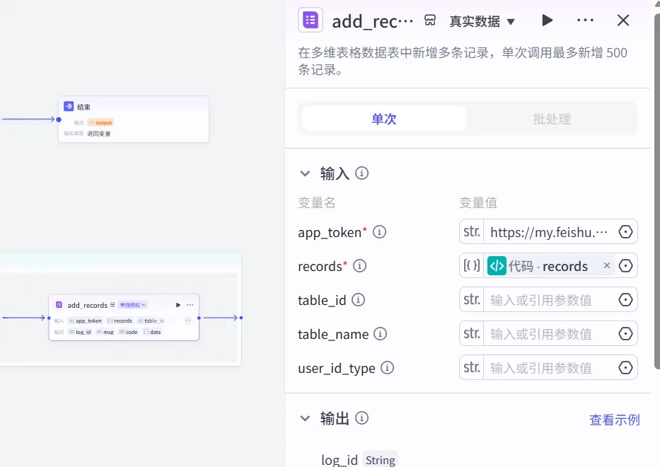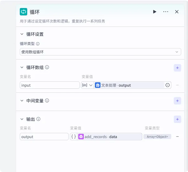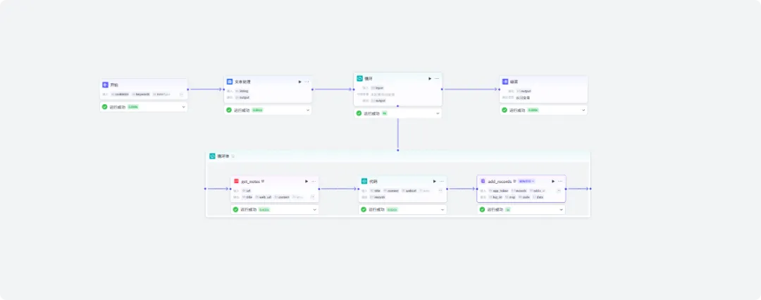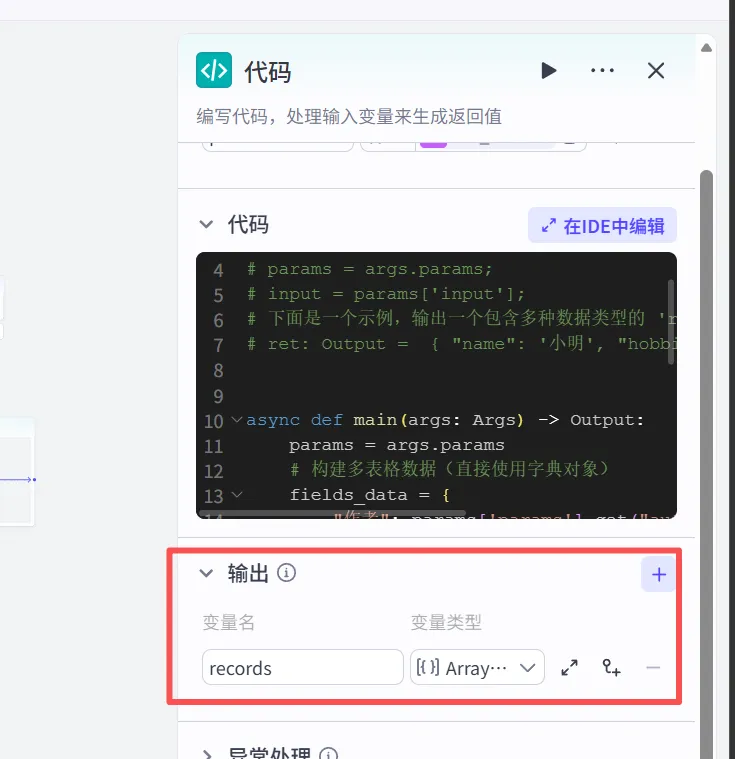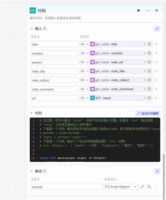 循环体里面再添加一个代码节点,主要是将小红书笔记的参数转换成飞书多维表格的参数格式,需要代码的可以后台【联系作者】
