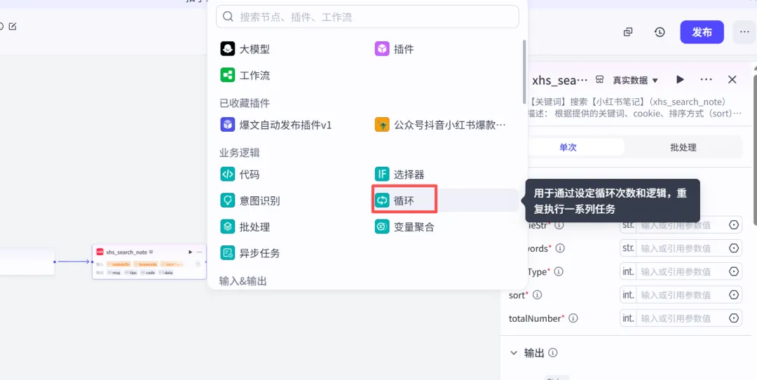 在循环体里面添加一个小红书的【get_notes】插件,插件里面搜索小红书关键字可以找到