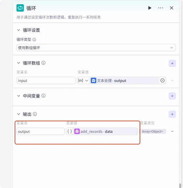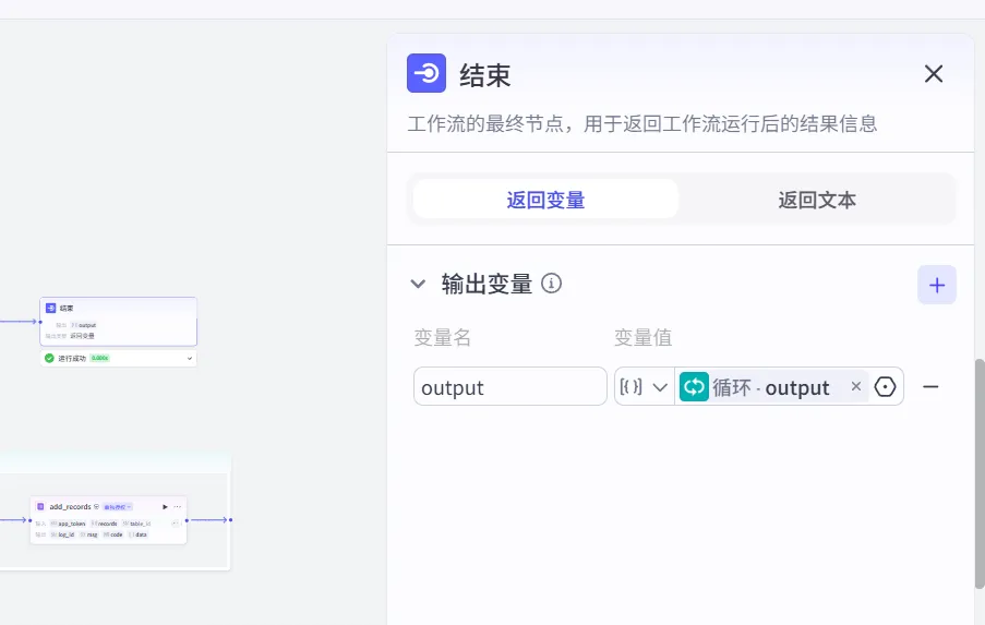 先设置一下循环节点的输出,再将【循环】节点连上结束节点,再设置一下输出参数,试运行没问题就可以发布工作流了
