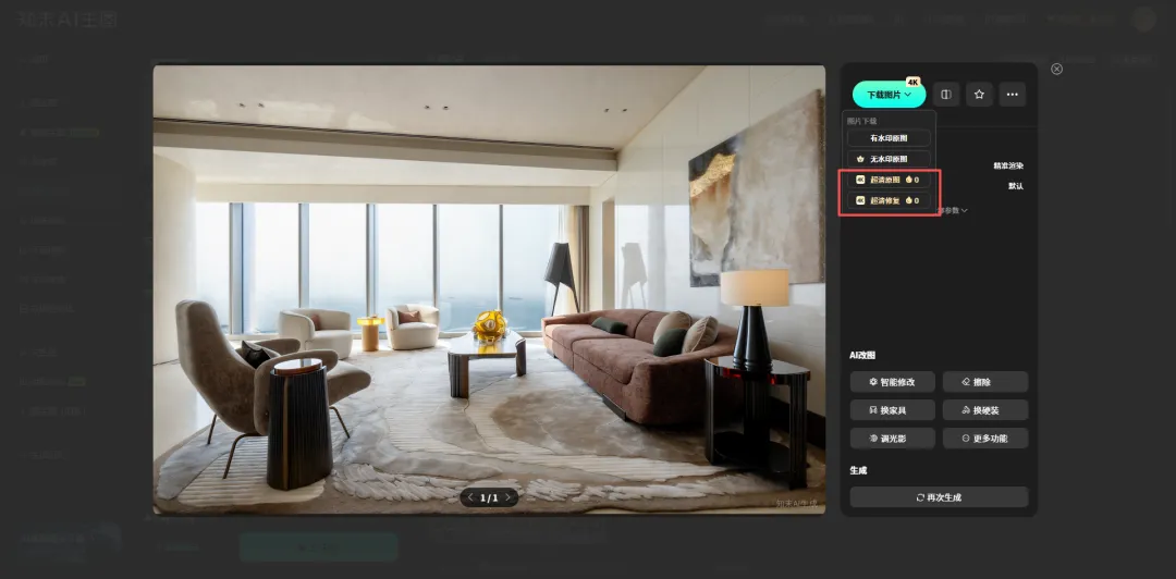 如果是用知末AI网站内生成素材,想直接拿到高清版本,操作步骤简单到离谱: