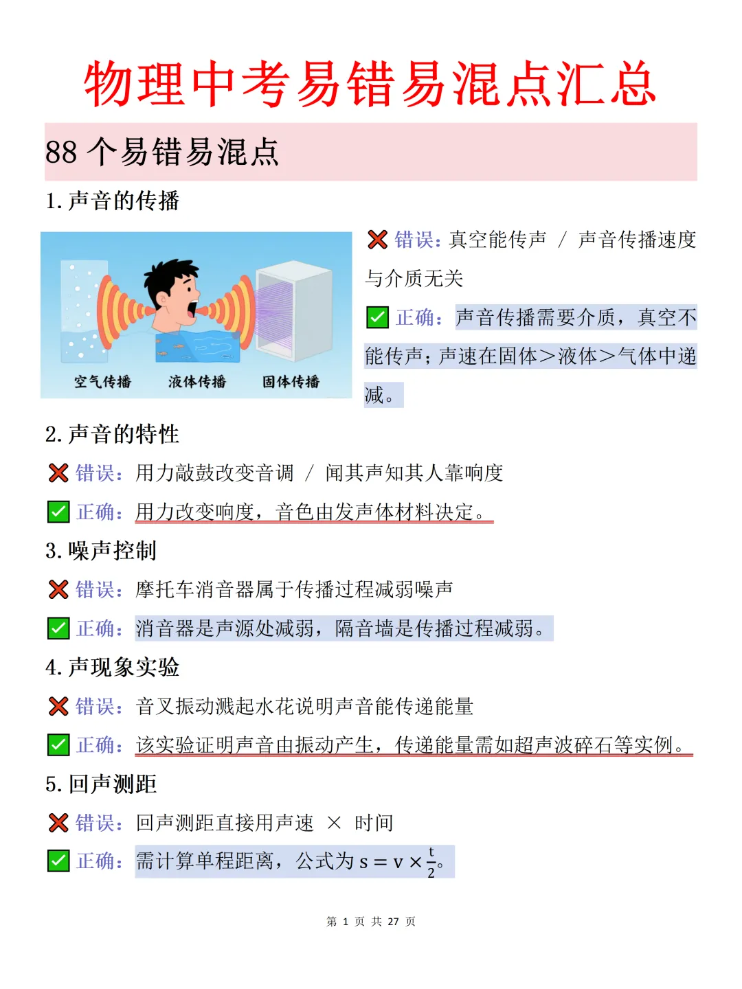 今天给大家整理了中考必备的【物理中考易错易混点汇总】,覆盖声音的传播、光的传播、力的作用等全场景常考话题,附详细答案与正错辨析,不管题目如何变式,都能精准应对,轻松拿下高分!
