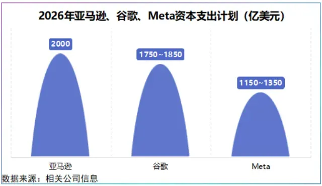 2026年,谷歌资本性支出计划1750-1850亿美元,几乎是2025年的两倍,亚马逊预计可达2000亿美元。
