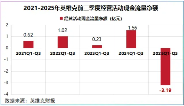 前三季度,公司经营活动现金流量净额降至-3.19亿元,为近五年首次在三季报中出现负值。