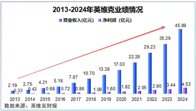 2013-2024年,英维克营收从不到3亿元跃升到45.89亿元,年均复合增速达31.86%,净利润更是从不到1亿元稳健增长至4.53亿元,年均复合增速达26.88%。