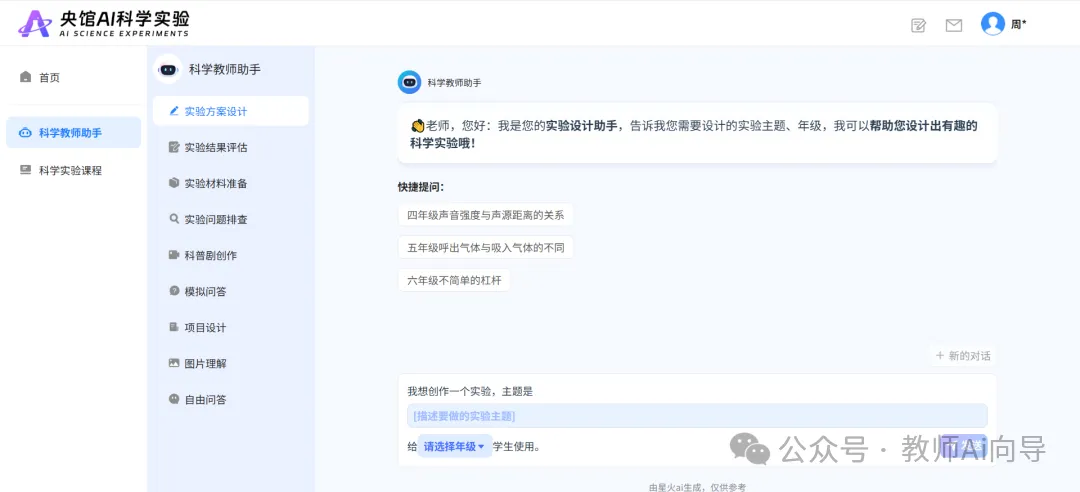 适用场景:小学科学实验教学设计、实验备课、结果批改,告别手工写实验方案、整理材料清单的繁琐。