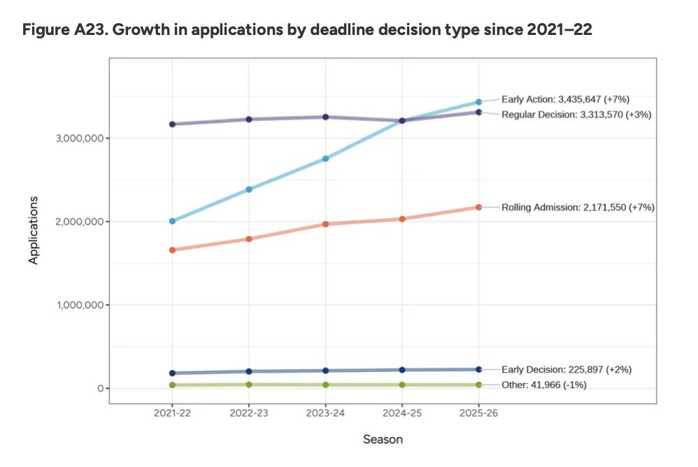 看懂了吗?人数只涨了2%,但份数涨了5%。这说明什么?越来越多的学生,在用“广撒网”的方式对抗不确定性。 多申几所,成了标配操作。