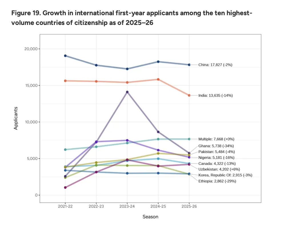 先上结论: 总申请人数在涨,人均申请学校数量在涨,标化提交率出现历史性反转。但国际申请者,尤其是非洲和亚洲生源,却大幅下滑了。