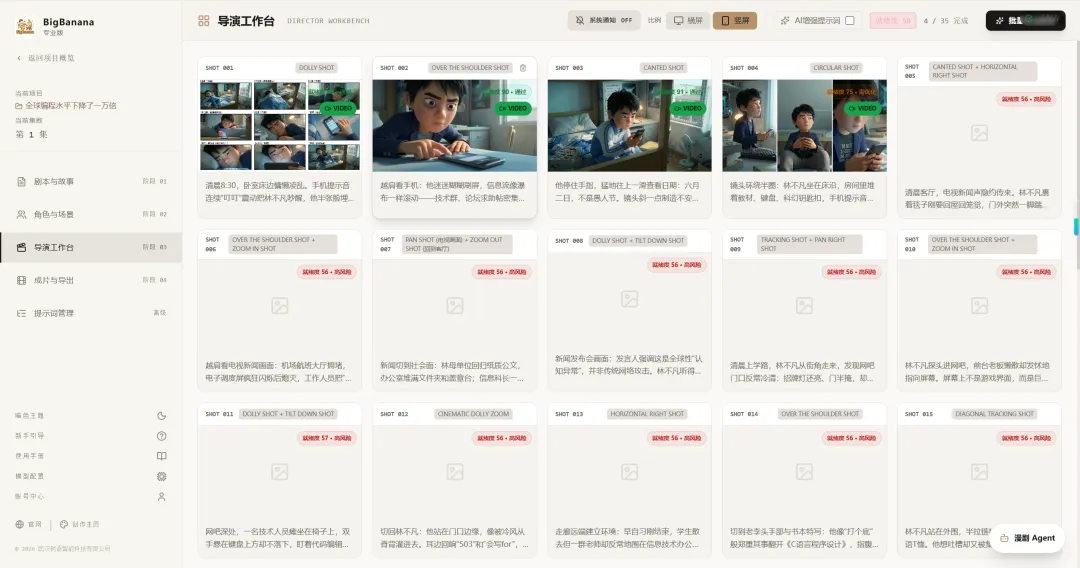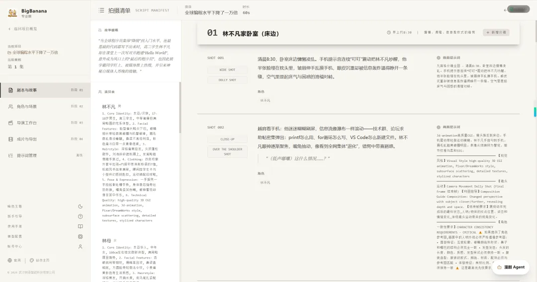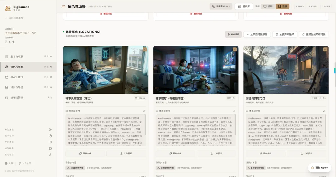 行业头部公司”艾神”透露,为杜绝 AI 生产不一致的问题,他们会在项目开始阶段就对色调、构图、人物服饰分门别类,提前生成。BigBanana 的设计思路与此不谋而合: